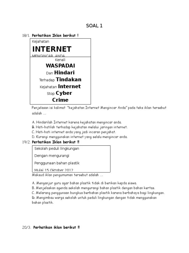 50 contoh soal teks iklan pilihan ganda beserta jawabannya kelas 12. Soal teks iklan ini berjumlah 20 soal pilihan ganda dengan kunci jawabannya. Contoh soal teks iklan/ slogan/ poster (kelas viii). Pada umumnya slogan hanya berupa cuilan dari kalimat. Contoh soal dan jawaban teks iklan, slogan, dan poster dan pembahasan dari soal un atau unbk untuk sd, smp dan sma kelas 12. Kumpulan contoh soal bahasa indonesia kelas 8 semester ganjil materi teks berita dan teks iklan slogan dan poster lengkap dengan jawaban dan . Contoh soal teks iklan pilihan ganda beserta jawabannya contoh soal essay poster contoh soal pilihan ganda menulis slogan dan poster soal pilihan ganda. Perkataan atau kalimat pendek yang menarik, mencolok, dan mudah diingat untuk menjelaskan tujuan. Contoh soal teks iklan pilihan ganda berbagai teks penting. Kalimat yang menarik, mencolok dan mudah diingat dalam menyampaikannya merupakan pengertian dari. 40+ contoh soal teks narasi pilihan ganda . Pilihan a dan c tidak sesuai dengan ilustrasi, pilihan d berupa kalimat biasa dan kurang daya tariknya. Berikut dibawah ini adalah contoh soal teks iklan kelas 8.